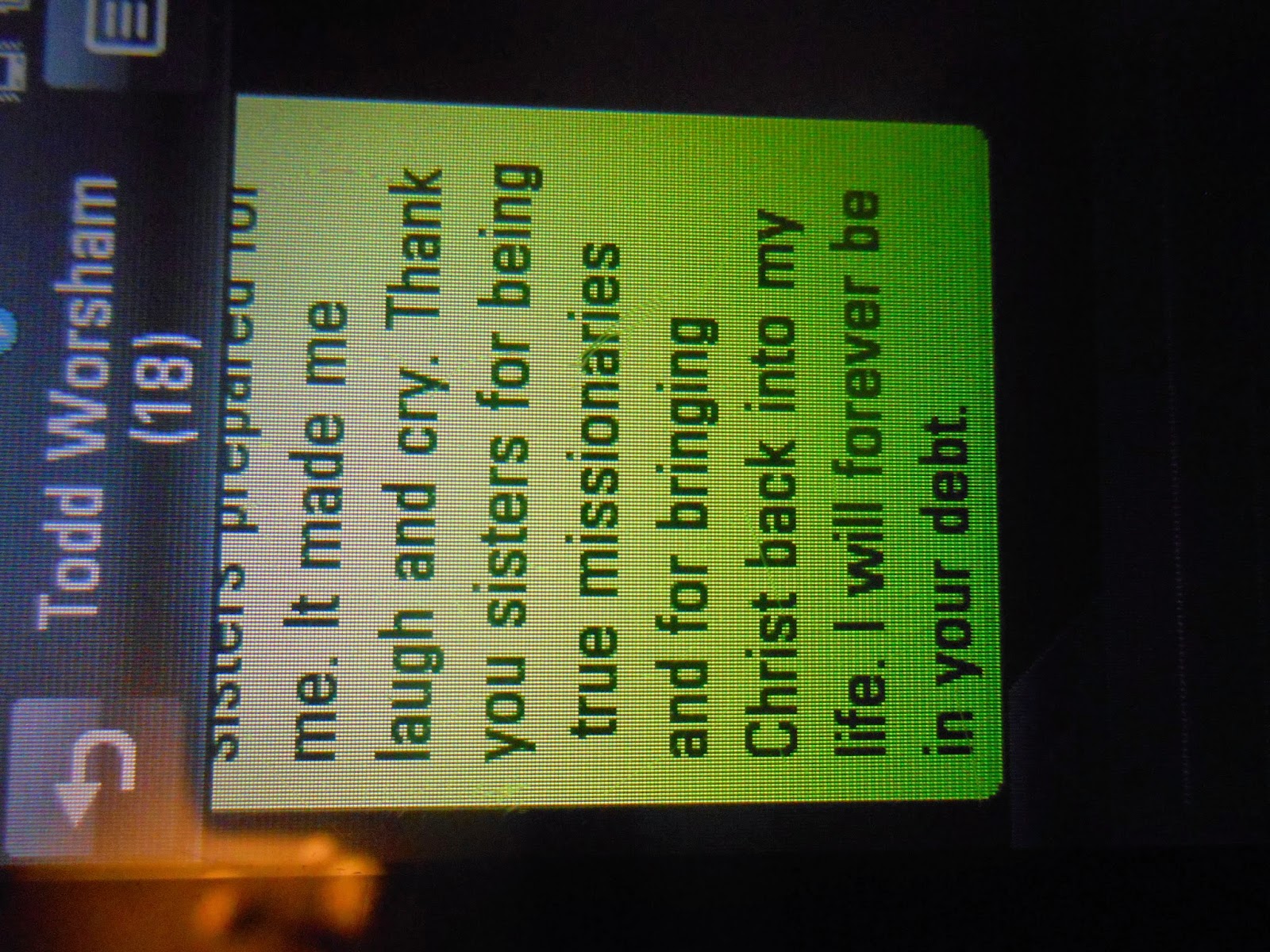 I feel like this week I personally didn't have a lot of proselyting times with extra meetings and such and then Sister Hanson was sick. But, the Lord provided. We had out mini missionary, Sister Lively. For the first few days of the week. She was so painfully shy. After district meeting on Tuesday I could see that she was nearly in tears. But that afternoon she really started to open up and have a good time. At the closing meeting she talked about how in the middle she wanted to go home but was so glad she didn't. And she thanked us for all that we did for her and for being an example to her. She is the sweetest girl and I know that when she serves she will touch many people.